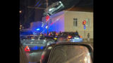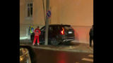 Un Volvo a „aterizat” pe trotuar, între un pilon electric